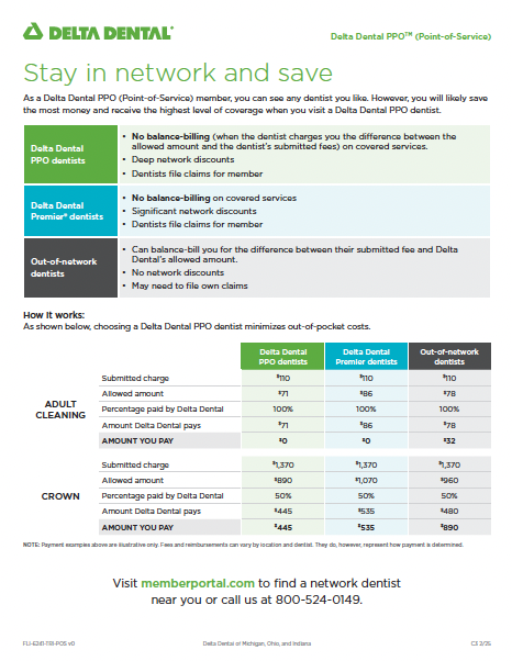 Members with a Delta Dental PPOTM (Point-of-Service) plan may see any dentist they like. However, there are advantages to choosing a dentist who participates in either the PPO or Delta Dental Premier® network.